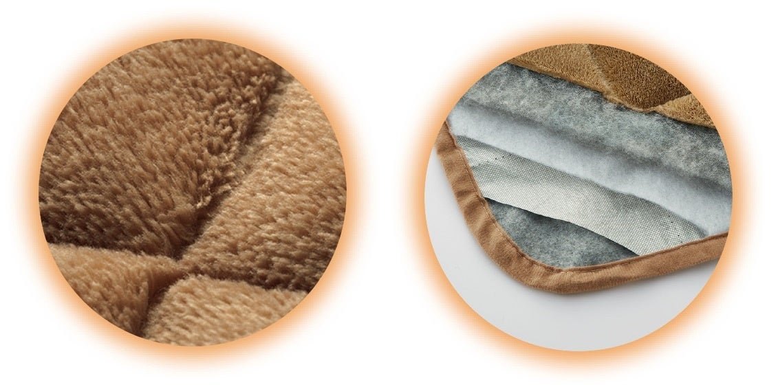 ふんわりとした肌触りの長毛フランネルの表地に加えて、暖かさをたっぷりため込む蓄熱わたと、アルミシート入り。