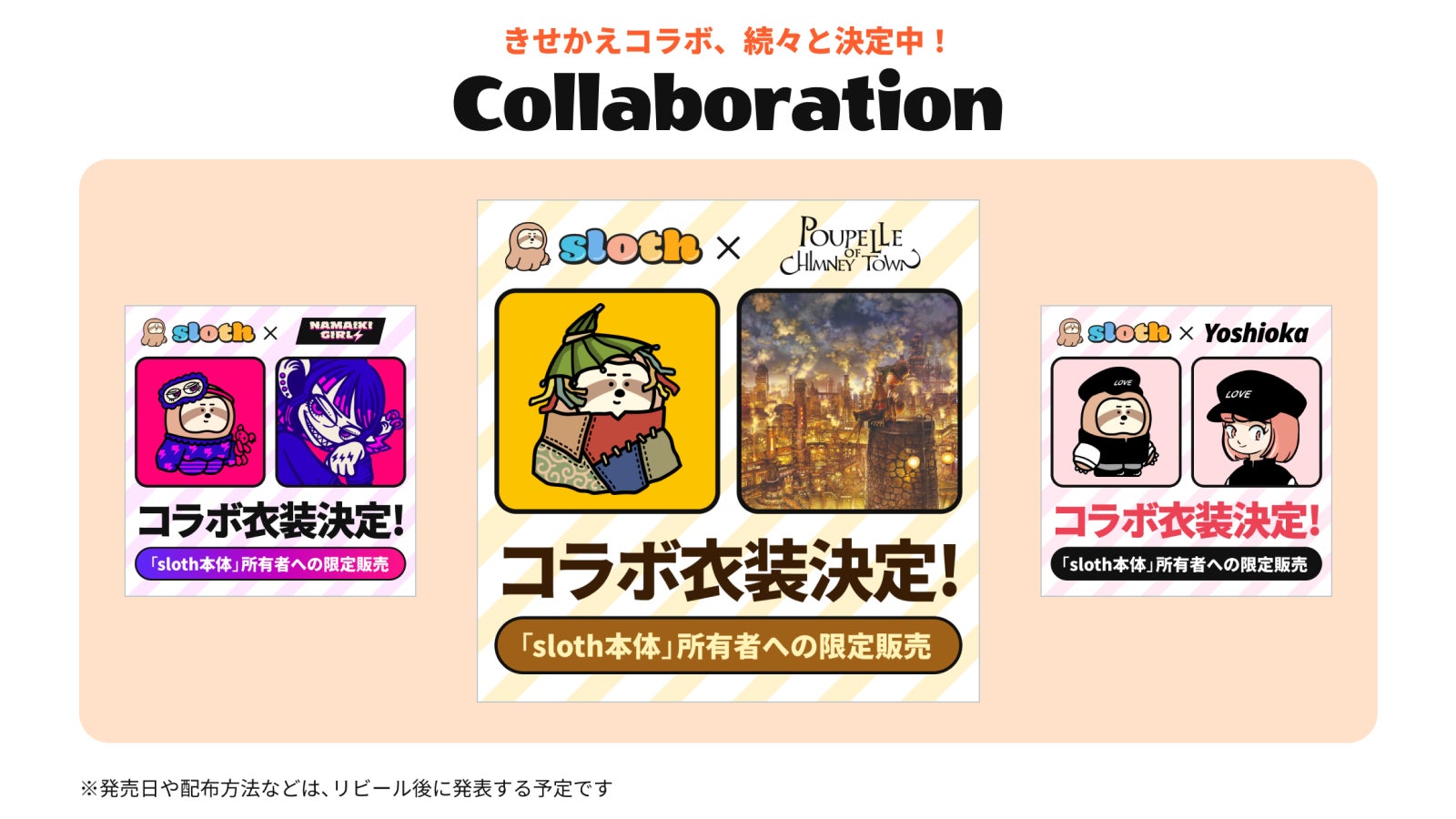 slothは、ナマケモノのキャラクターである本体NFTと、衣装NFT、アイテムNFTの3種類があり、今年3月下旬に公開を予定している専用サイトで着せ替えができます。