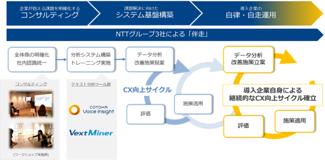 本ソリューションは、蓄積された音声データの活用によるCX向上を多くの企業で成功させてきたNTTグループ3社が、積み重ねた知見と最適なICT技術を活用し提供します。