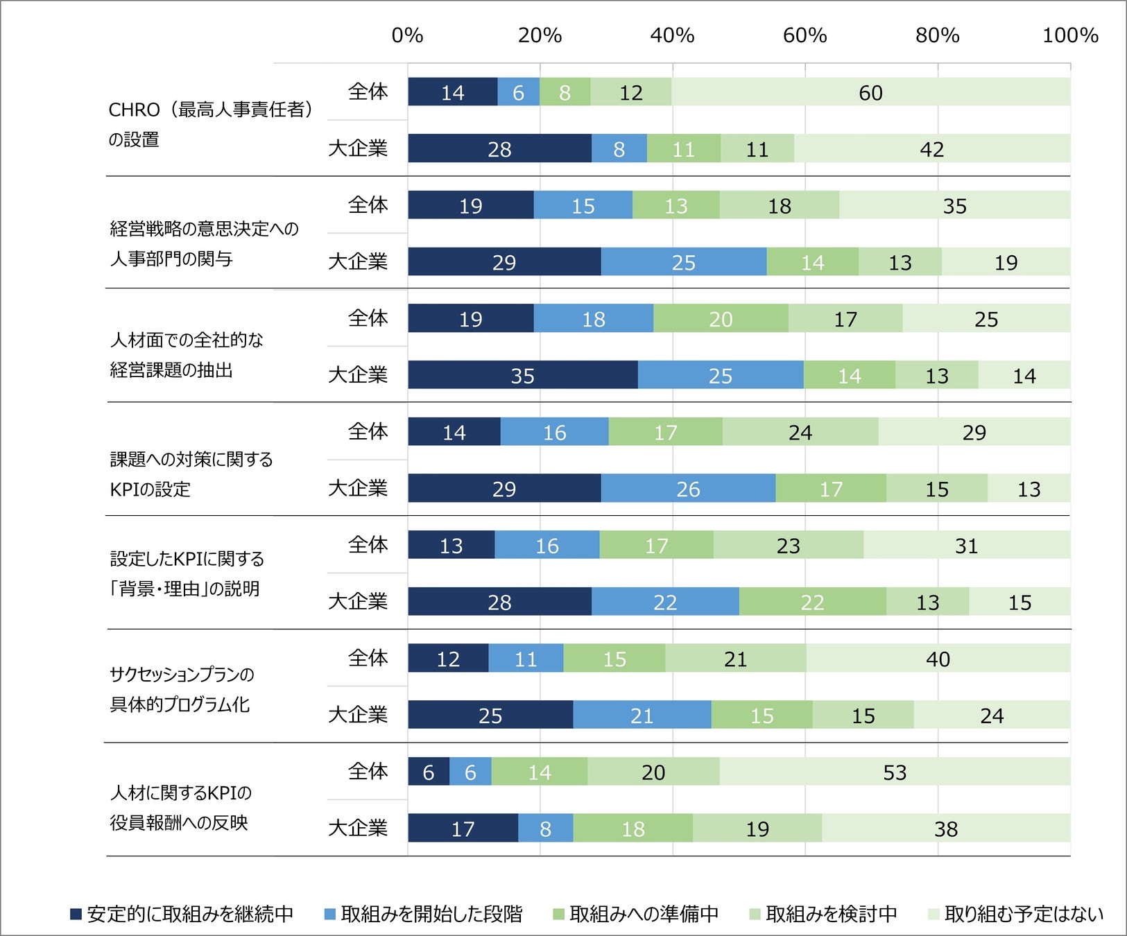 大企業で「取り組み中」の割合が最も高いのは「人材面での全社的な経営課題の抽出」で60%(全体37%)と6割に上る。昨年調査では「経営戦略の意思決定への人事部門の関与」(55%)が最多だったことを踏まえると、やや踏み込んだステージに入っている企業が増えていることが推測される。一方、大企業での「取り組み中」の割合が最も低くなっている項目は昨年と同じで「人材に関するKPIの役員報酬への反映」で25%(全体12%)となり、「人材面での全社的な経営課題の抽出」より35ポイント低く、項目により取り組み状況が顕著に異なることが分かる。ただし、大企業で「取り組み中」の割合が過半数に達している項目が4項目ある(昨年調査では1項目のみ)ことは、取り組みを進めている企業が増加していることが期待される。