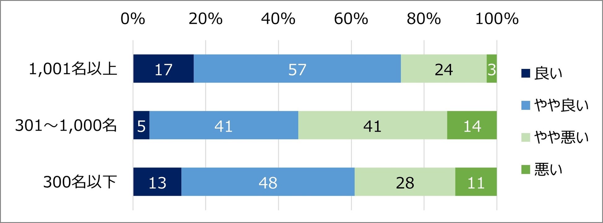 現在の業況を企業規模別に見てみると、「良い」の割合は大企業で17%、中堅企業で5%、中小企業で13%と、いずれも2割未満にとどまっている。「やや良い」まで含めた「良い派」については、大企業では74%、中堅企業では46%、中小企業では61%となり、大企業と中小企業では業況が良い傾向で、中堅企業では比較的悪い傾向となっている。