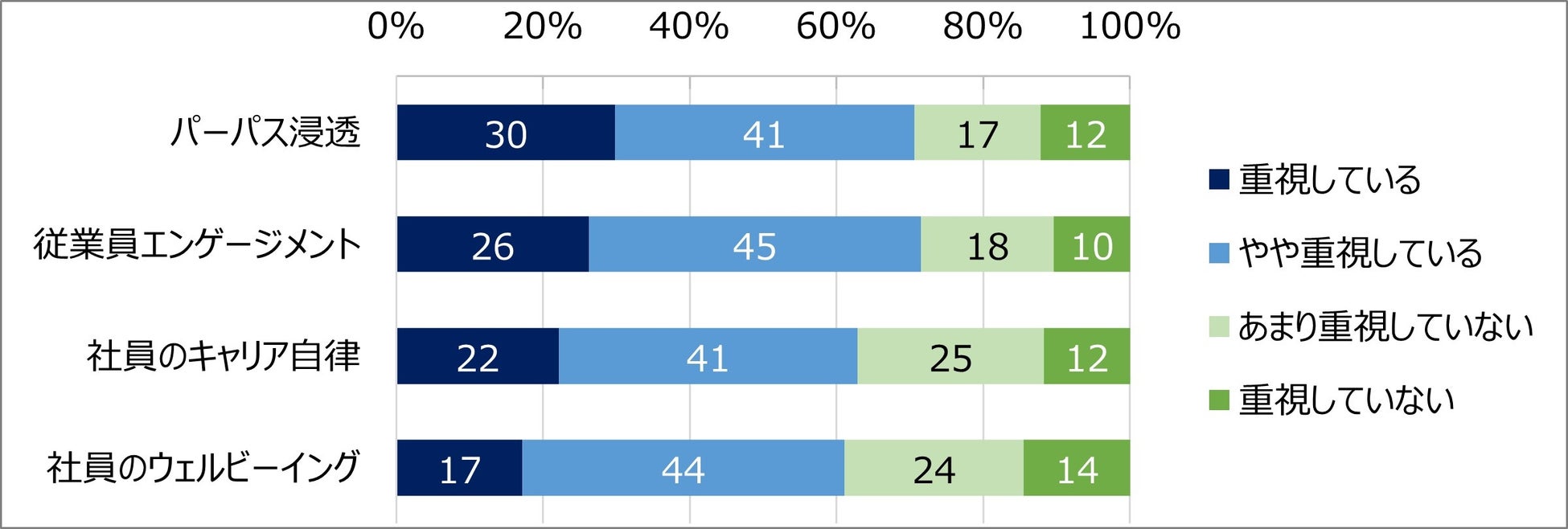 「パーパス浸透」、「従業員エンゲージメント」、「社員のキャリア自律」、「社員のウェルビーイング」の4つの人材施策について、重視度を見てみる。