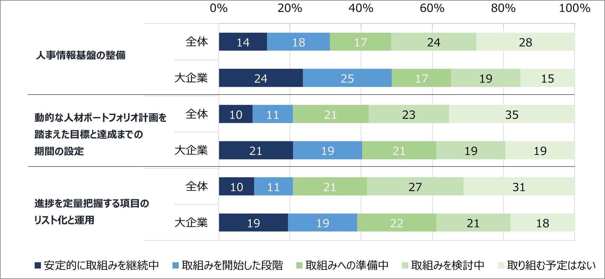 「人事情報基盤の整備」の「取り組み中」の割合が最も多く、大企業で49%(昨年40%)、全体で32%となっている(図表6-2)。他2項目は「人事情報基盤の整備」ができた上で、現在の姿と目指すべき姿のギャップを定量的に可視化するために必要な取組みであり、今後、各種の取組みを計画的かつ効果的に進める中で、重要なステップとなる。