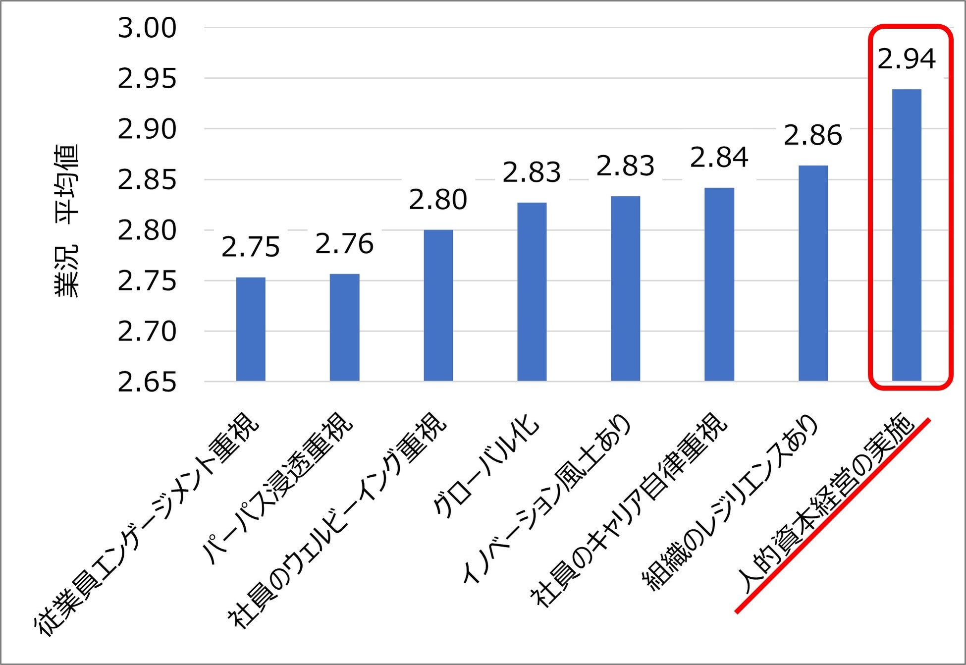 その結果、最も業況の平均値が高いのは「人的資本経営の実施」企業群で2.94となっている。一方、最も平均値が低いのは「従業員エンゲージメント重視」企業群で2.75となっている。