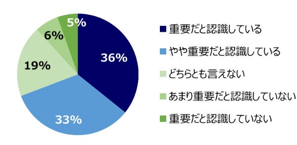 「重要だと認識している」が最多で36%、次いで「やや重要だと認識している」が33%となり、これらを合わせて「重視派」は69%とほぼ7割に上っている。一方、「あまり重要だと認識していない」(6%)と「重要だと認識していない」(5%)を合わせた「重視していない派」はわずか11%で、重視派の割合の方が58ポイントもの差で上回っている。