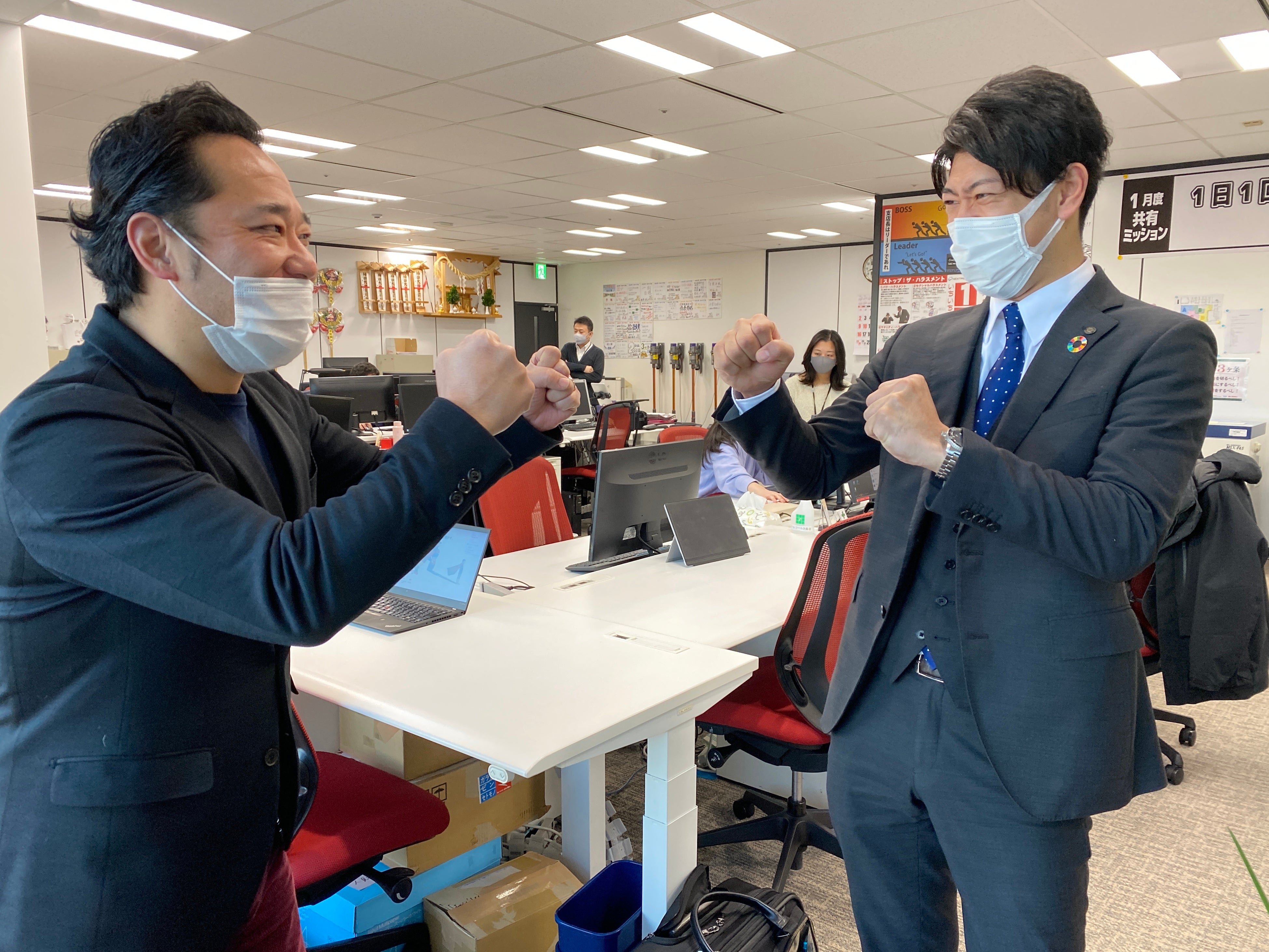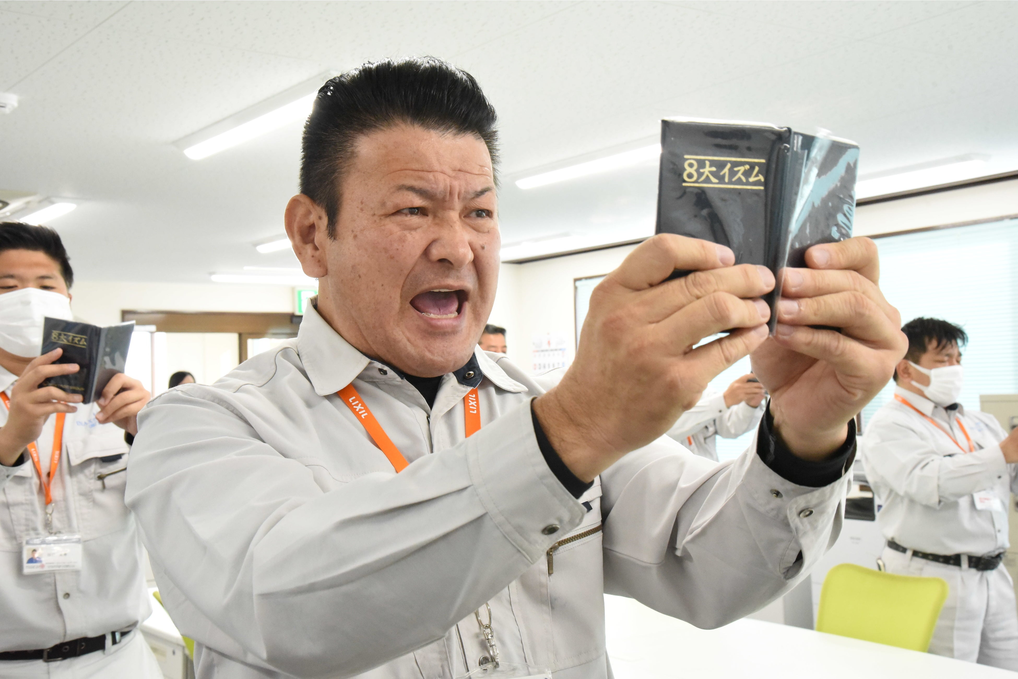 - 声量が熱い…当社では毎日朝礼が行われます。「ソウルブック」をもち、経営理念やスローガン、社訓などを全力で唱和します。社員一人一人がそこで全てを出し切ることで朝の状態を高めます。声量の大きい支店では90デシベル以上(例:犬の鳴き声5m、騒々しい工場の中に匹敵)になるほどです。※写真撮影時のみ表情がわかるようにマスクを外しています。