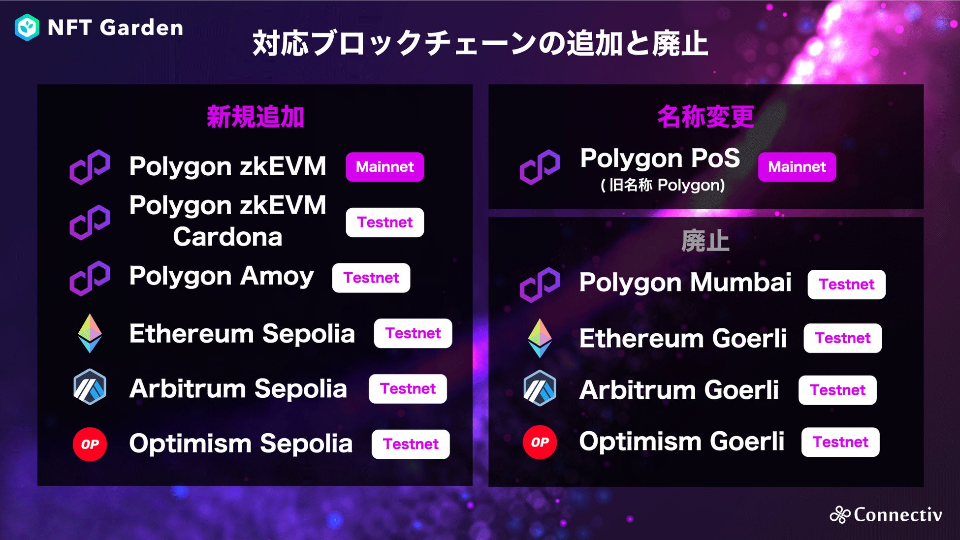 また今回はその他にも、ブロックチェーン側のアップデートに合わせ、Polygon、Ethereum、Arbitrum、Optimismなどの最新テストネット環境への対応を行いました。それに伴い、旧テストネット環境となる一部のネットワークを廃止いたしました。