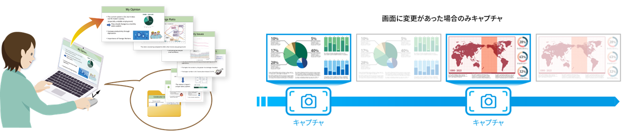 オンライン会議や授業で共有されるスライドの画面キャプチャ保存に気を取られて話を聞いていなかった、ということはありませんか?「Quick Capture」は、画面が変化すると自動でキャプチャして保存してくれるので、自分でスライドをキャプチャする手間を省くことができ、会議や授業に集中できます。