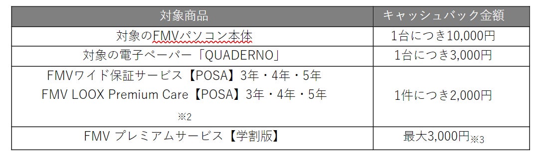 ※3 「FMV プレミアムサービス【学割版】」は、ご購入商品によってキャッシュバック金額が異なります。