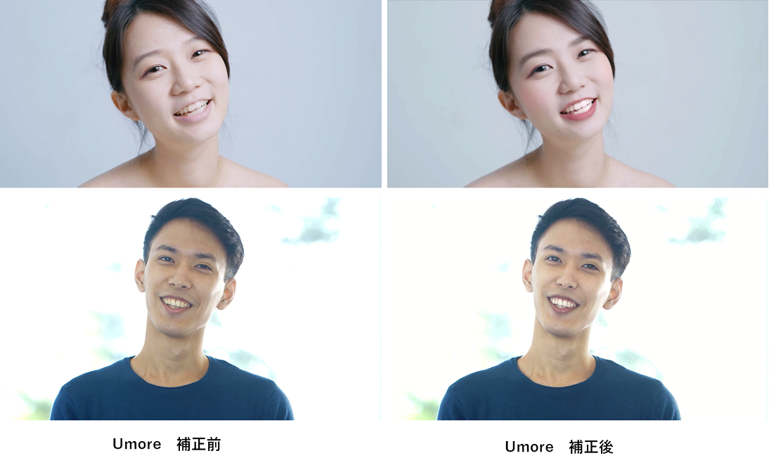 FMV独自のAIメイクアップアプリ「Umore」の機能を強化し、オンライン会話をさらに楽しんでいただけるようになりました。従来の補正効果に加えて、お客様から要望の多かった「美白」「小鼻」「白い歯」の効果を、このたび新たに追加しました。使いやすいユーザーインターフェースはそのままに、これまで以上に好印象な自分を演出できます。