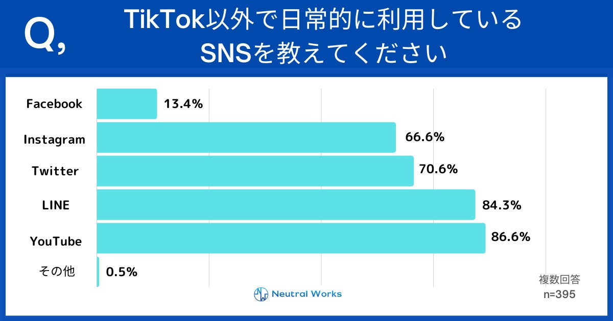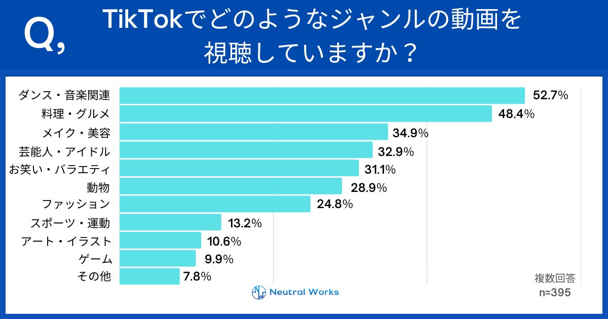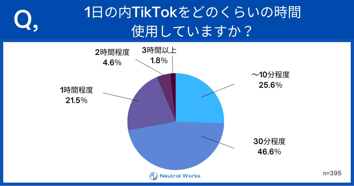 デジタルマーケティング支援をしている株式会社ニュートラルワークス(神奈川県茅ヶ崎市 代表取締役:三木五月、以下「ニュートラルワークス」)は、TikTokを日常的に使用している男女395名を対象に、TikTokの利用に関する実態調査を行いました。