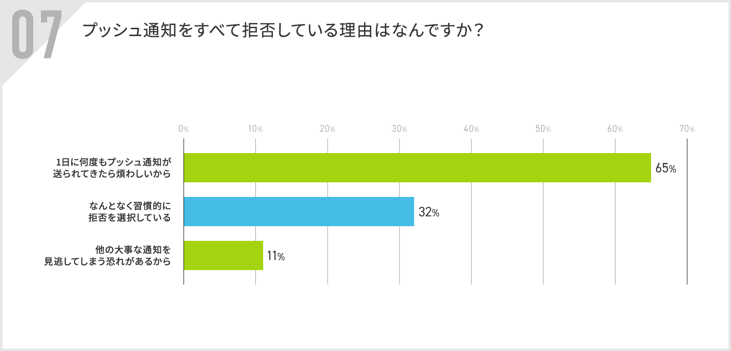 Q2でプッシュ通知を「すべて拒否している」と選択した人にその理由を伺ったところ、「1日に何度もプッシュ通知が送られてきたら煩わしいから」と選択した人が65%で最多でした。習慣的に拒否している人も32%と高い割合を示しました。