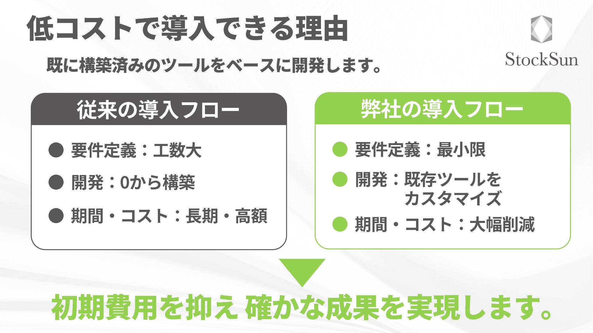 既に構築・運用実績のあるソリューションをベースに提供することで、通常50万円規模の開発を20万円前後で実現可能。