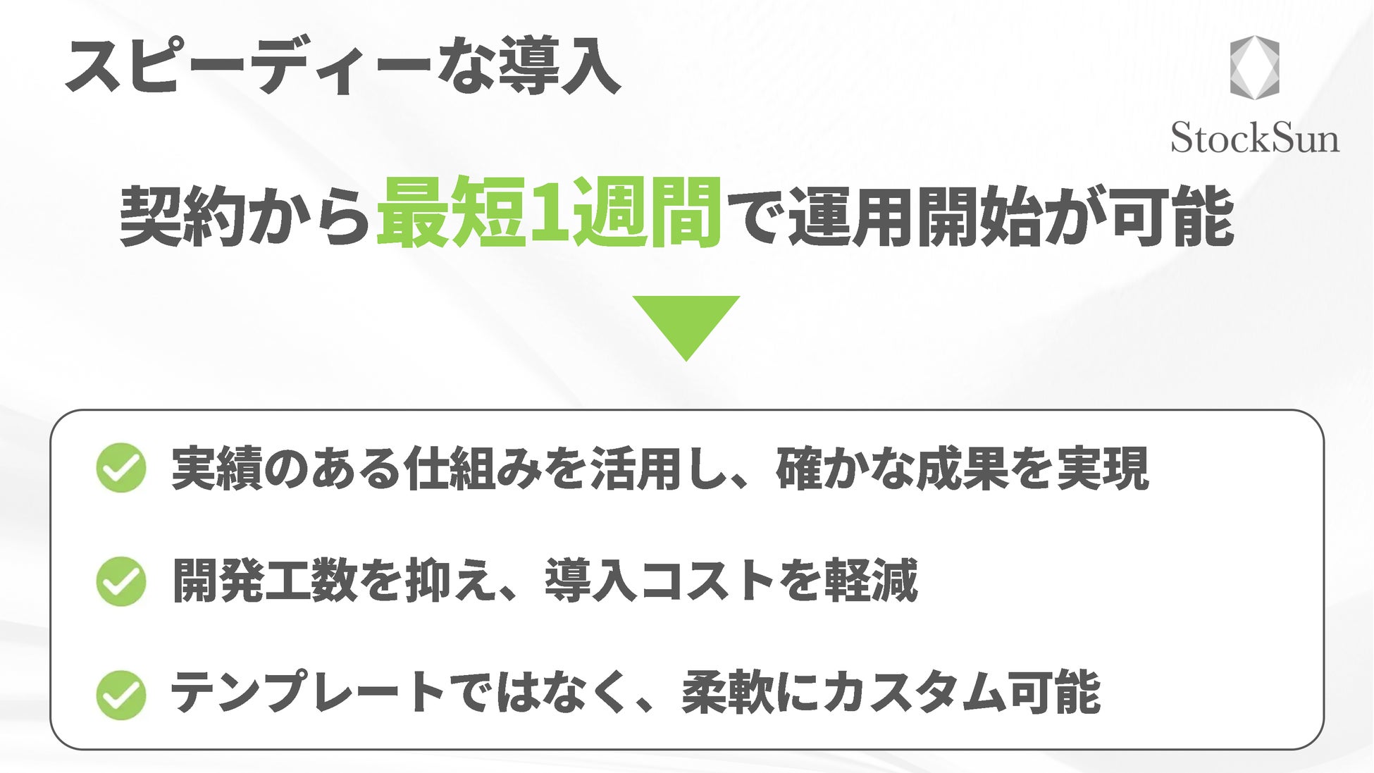 テンプレートではなく、StockSunが実際に運用してきた自動レポート生成・レス漏れ通知などのDXプロジェクトを基に、業種や業務フローに合わせて調整。自社の業務にフィットした形で導入できます。