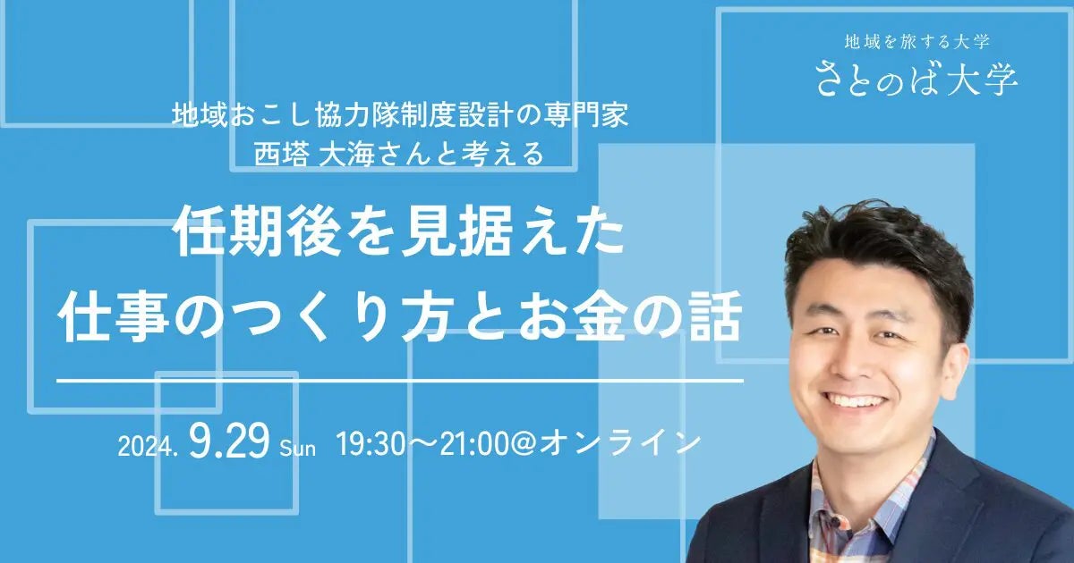 地域を旅する大学 さとのば大学(運営:株式会社アスノオト 代表取締役:信岡良亮、所在地:東京都千代田区、以下当社)は、地域おこし協力隊・地域コーディネーターなど、特定のフィールドで地域に根ざした活動をされている方を対象に、地域共創領域のプロフェッショナルであるさとのば大学講師陣による特別講義を開講します。9/29は、地域おこし協力隊の制度づくりにも携わっていらっしゃる西塔大海さんを講師に招き、協力隊任期後を見据えた仕事のつくり方とリアルなお金のことについて考えます。すでに地域で活動している方はもちろん、「さとのばの講義を体験してみたい」という方もご参加いただけます。