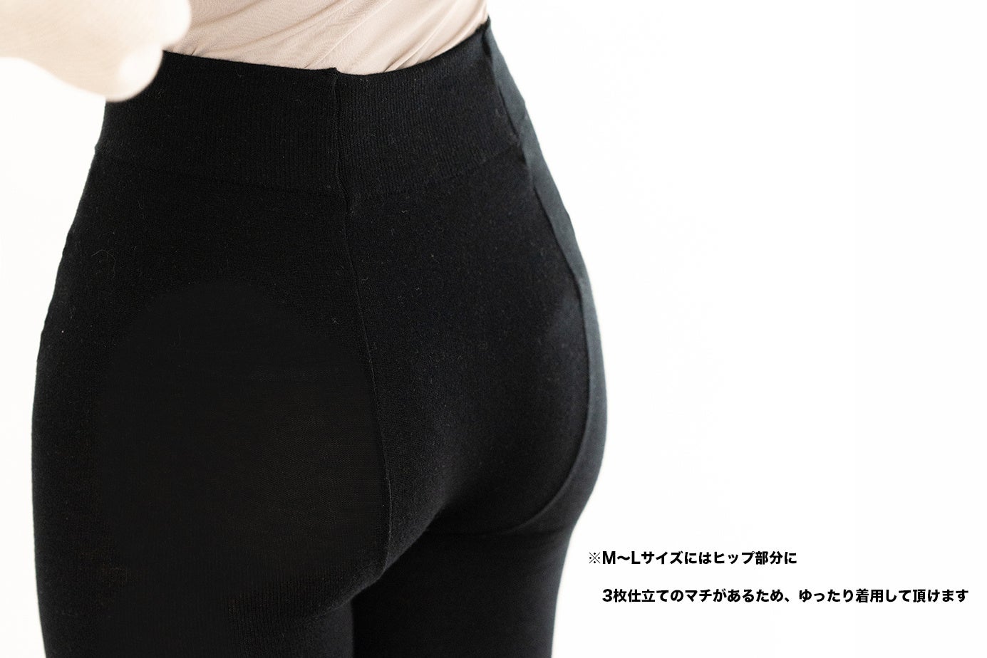 ・M~Lサイズ:ヒップ部分を「3枚仕立て」にすることでマチをしっかり確保。こうすることで下半身の体型を問わず、お尻からお腹にかけて締め付け感なく、ゆったりとした穿き心地に。