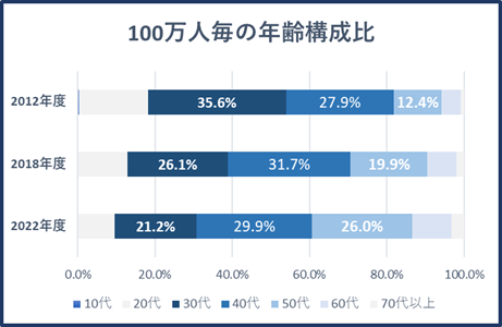 Dクリニックは、1999年開院以降多くの患者様を治療してまいりました。2012年度には累計100万人※3の治療実績を突破し、6年後には累計200万人※4を突破。そして、2022年度には累計300万人※1超の治療実績を有するグループとなりました。100万人毎の年齢構成を見てみると、時が進むにつれ年齢層が高くなっていることがわかります。背景としては、Dクリニックで治療を始められた多くの患者様が、複数年にわたって治療を継続しているためと考えられます。近年ではAGA治療が多様化し、オンラインで診察を行えるオンラインクリニックも増えてきています。薄毛に悩む方がより手軽に、治療を行える時代になってきており、気軽にAGA治療を行える時代に変化してきています。Dクリニックは対面での診療に重きをおき、今後も安心して治療を行える医療サービスを提供してまいります。