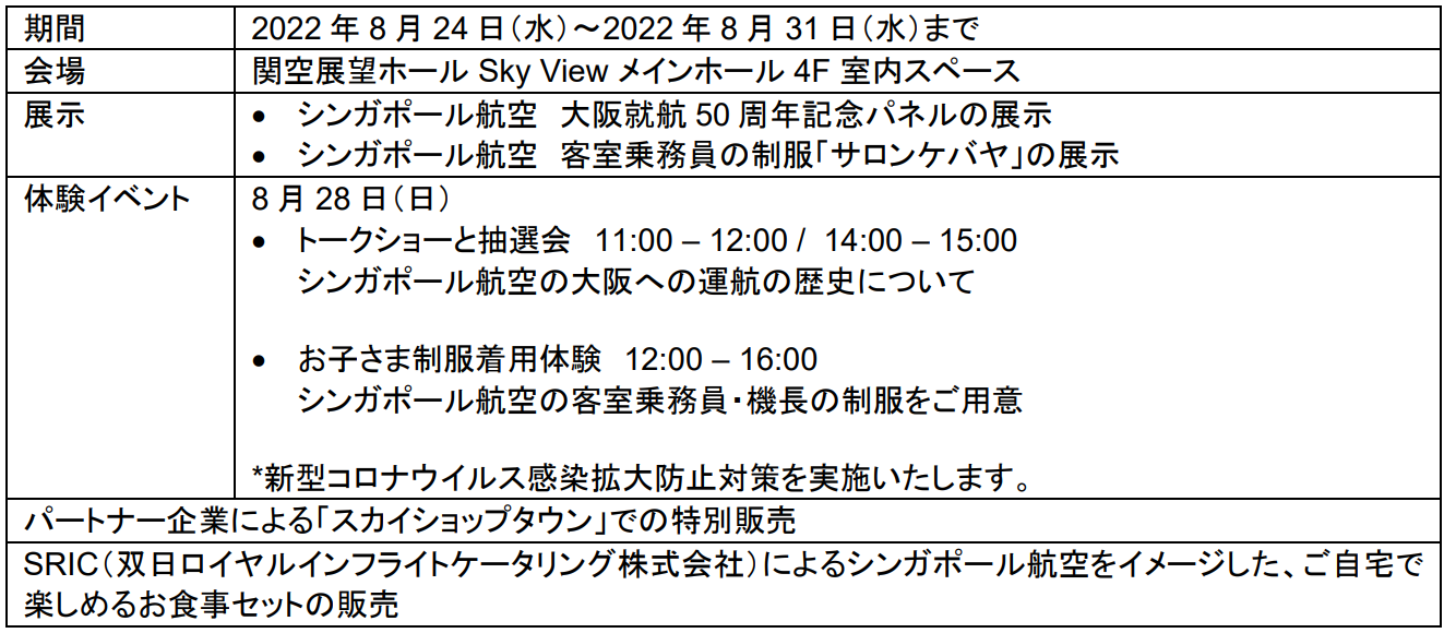 この節目の年を記念し、お客様への感謝の気持ちを込めて、シンガポール航空では様々な取り組みを実施致します。その第一弾として、関西エアポートと共同で「シンガポール航空 大阪就航50周年イベント」を開催いたします。