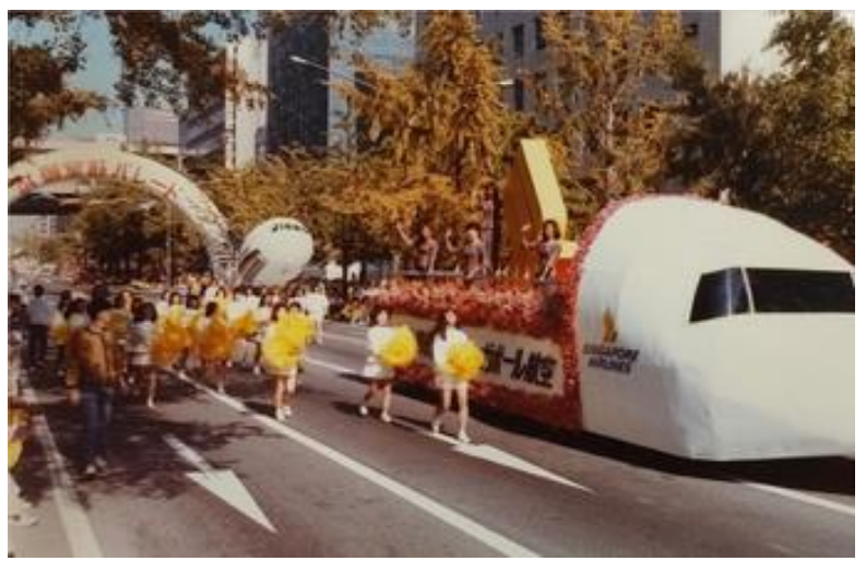 第一回御堂筋パレードに参加。民族衣装のサロンケバヤに身をまとった客室乗務員が、航空機をモチーフにしたフロートに乗って登場。