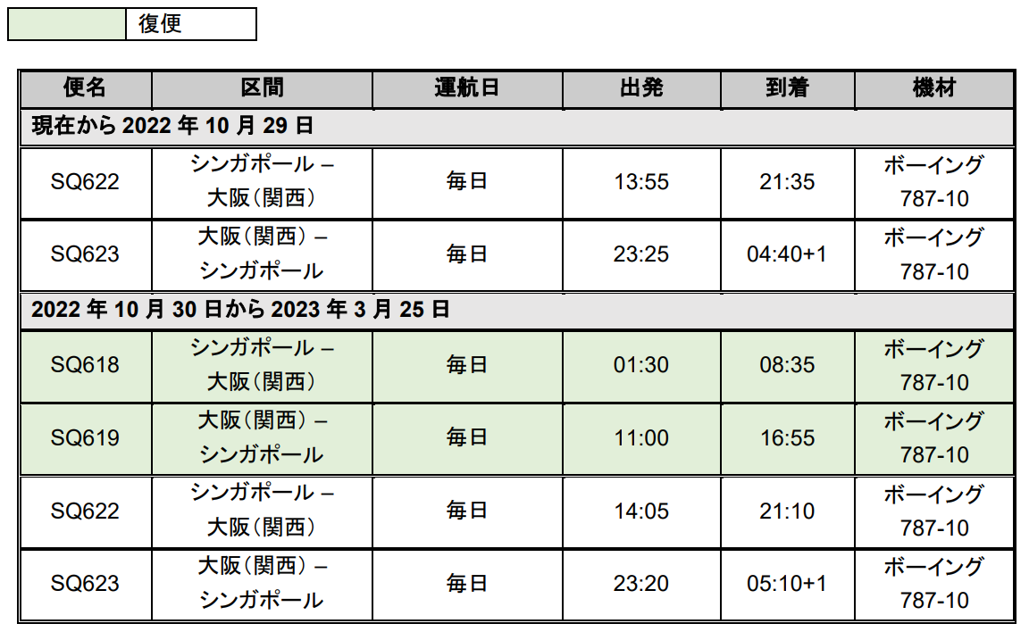 シンガポール航空は、今後数か月の内に日本各地へ復便予定です。大阪(関西)発シンガポール発行きのSQ619便は2022年10月30日より復便され、シンガポール―大阪(関西)間の運航は毎日1日2便となる予定です。これにより、冬期スケジュール(2022年10月30日~2023年3月25日)ではシンガポール航空の大阪へのキャパシティ(提供座席数)は、新型コロナウイルス感染拡大前の67%、日本へのキャパシティは62%になります。高まる航空需要にお応えし、お客様にはより多くの選択肢から旅行をご計画いただけるようになります。