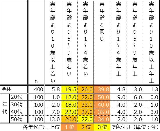 年齢があがるほど「実年齢より若い」の回答率が増加、50代では60%以上が「若い」と回答