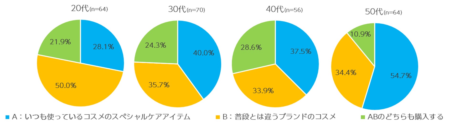 購入するコスメブランドについては、20代は「普段とは違うブランド」、30代以降は「いつも使っているコスメのスペシャルケアアイテム」が多い