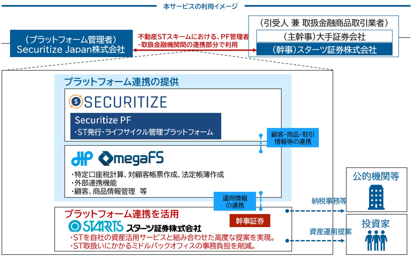今回の連携サービスを利用したセキュリティ・トークンの第一弾として、スターツ証券株式会社(以下:スターツ証券)は、先般発表されたスターツ・アセット・トークン~両国・千鳥町~(譲渡制限付)の顧客管理を開始しました。これにより、スターツ証券が展開する「金融から不動産まで」を一貫して支援する資産活用サービスに、不動産セキュリティ・トークン(以下:ST)をシームレスに組み込むことが可能となり、投資家に対して不動産STのメリットを活かした総合的な資産運用提案を提供できるようになります。