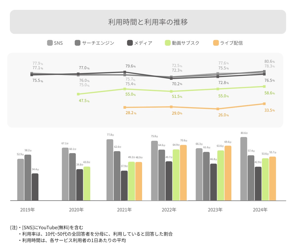 ▼利用時間と利用率の推移_「SNS」、「サーチエンジン」、「メディア」、「動画サブスク」、「ライブ配信」