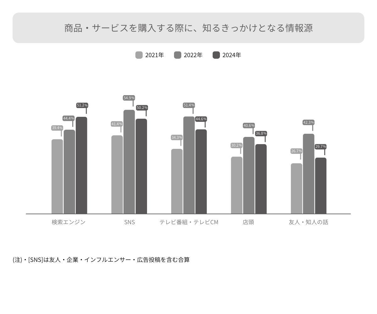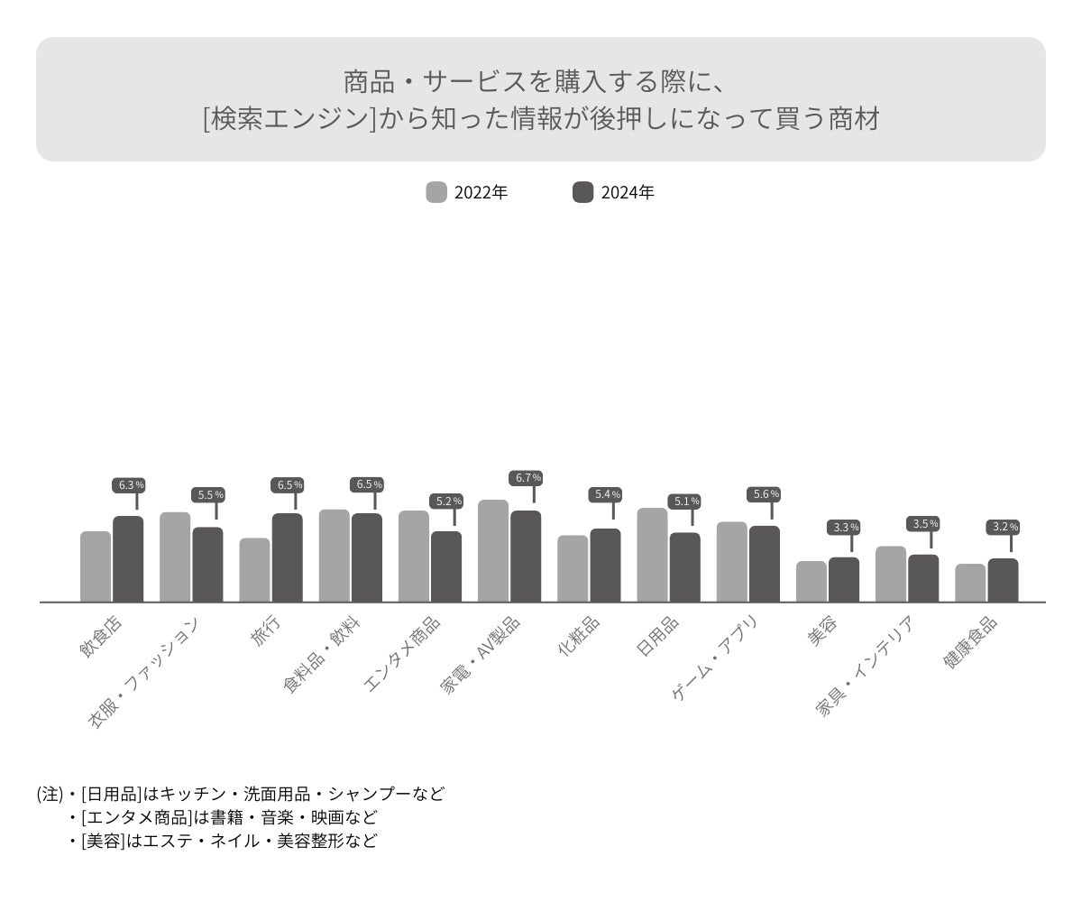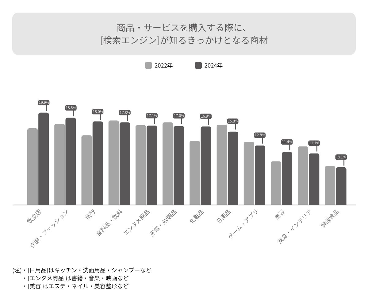 2022年から2024年にかけて「旅行」、「飲食店」、「美容」、「衣服・ファッション」、「化粧品」が伸びています。新型コロナウィルス感染症対策の緩和がより進みコミュニケーションの機会が戻ることで外向き志向に移ったこと、「モノの消費」から「コトの消費」へと消費の嗜好が傾いてきたことなどが要因と考えられます。これらの商品・サービスについては、「検索エンジン」を使い能動的に情報取得することが、その後の購買までつながりやすくなっていると思われます。