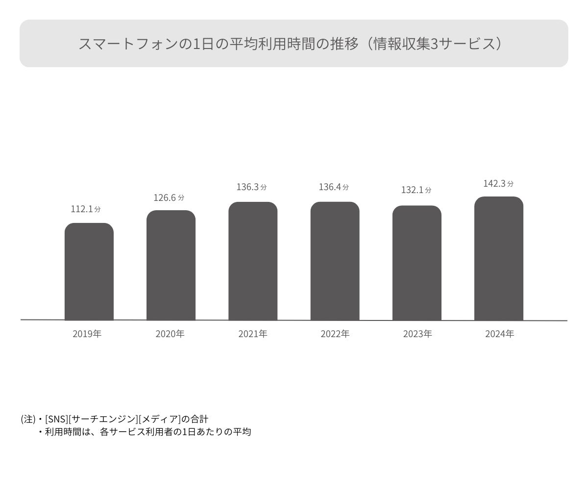 情報収集におけるスマートフォンの利用時間は、スマートフォンでの情報収集を「SNS」、「サーチエンジン」、「メディア」の3サービスに、「動画サブスク」、「ライブ配信」を加えた5サービスに分け経年で利用状況を調査していますが、3サービスの場合も5サービスの場合も2023年と比較し、伸びています。牽引しているのは「SNS」となっており、「SNS」以外の「サーチエンジン」、「メディア」、「動画サブスク」、「ライブ配信」はいずれも平均利用時間が短くなりました。