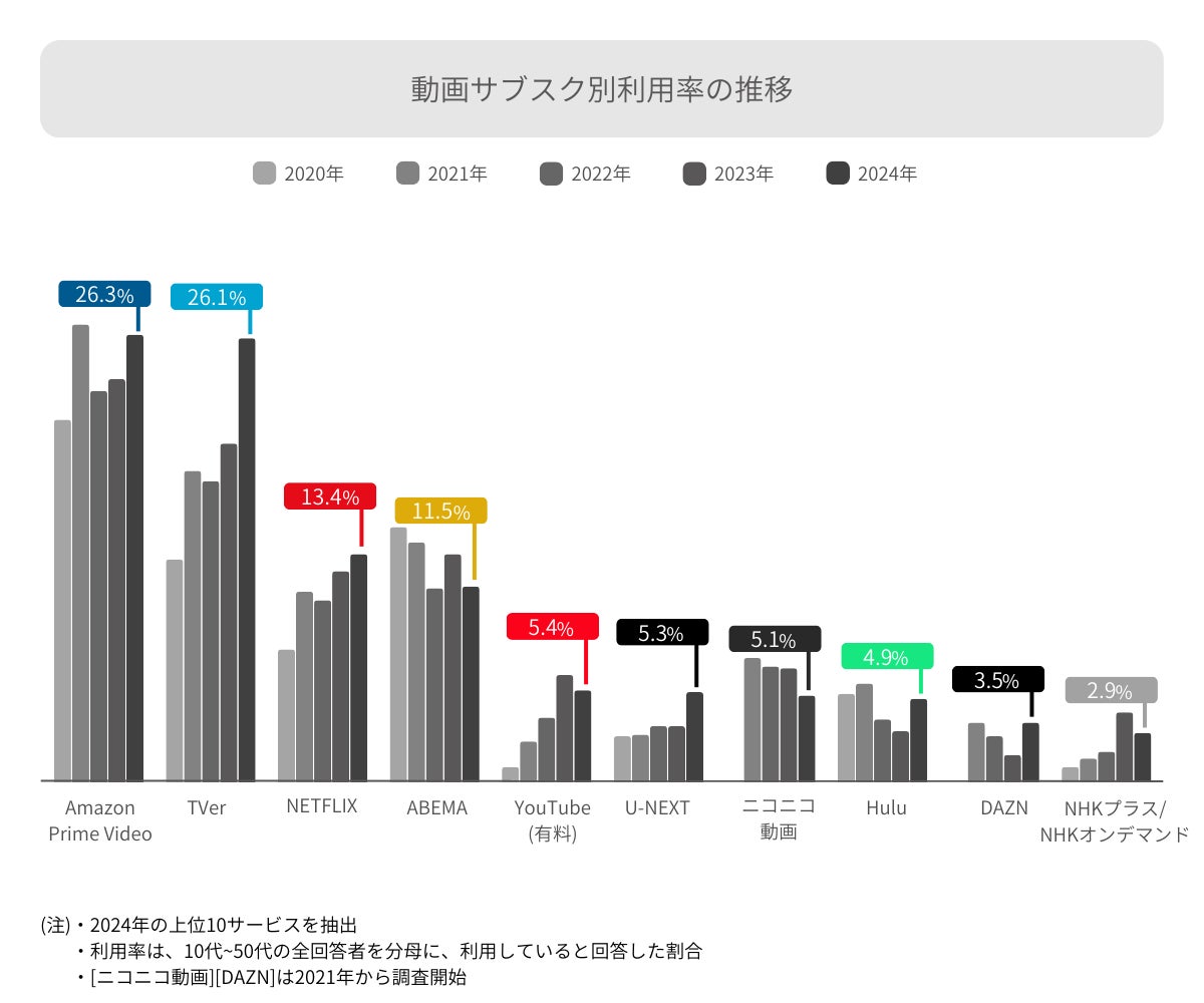「動画サブスク」では、「TVer」が大幅に利用率を伸ばし「Amazonプライム・ビデオ」と並んで2強となりました。提供を終了したサービスもあり、サービス間の明暗が分かれています。