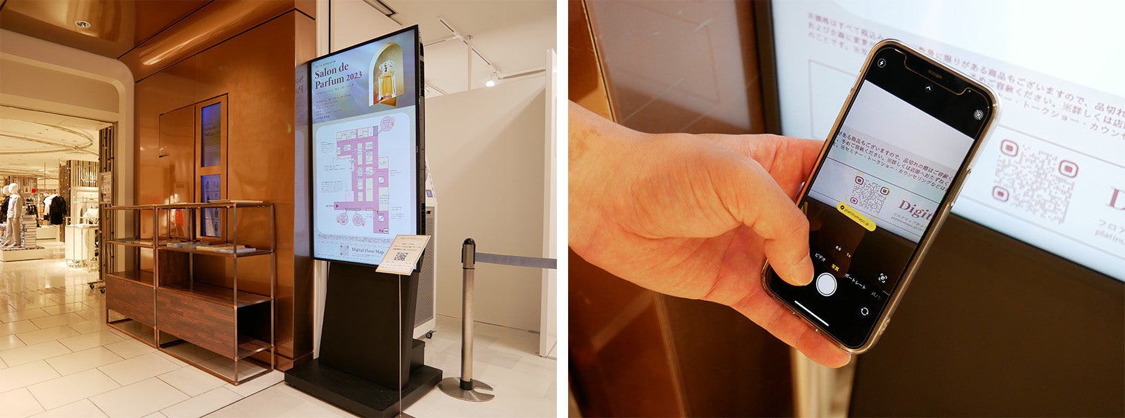 「サロン ド パルファン 2023」開催期間中、デジタルフロアマップを表示したサイネージを催事場入口に設置。QRコードを併記し、来訪者が自身のスマートフォンでQRコードを読み取り、会場でスマートフォンからデジタルフロアマップを利用したのか検証しました。