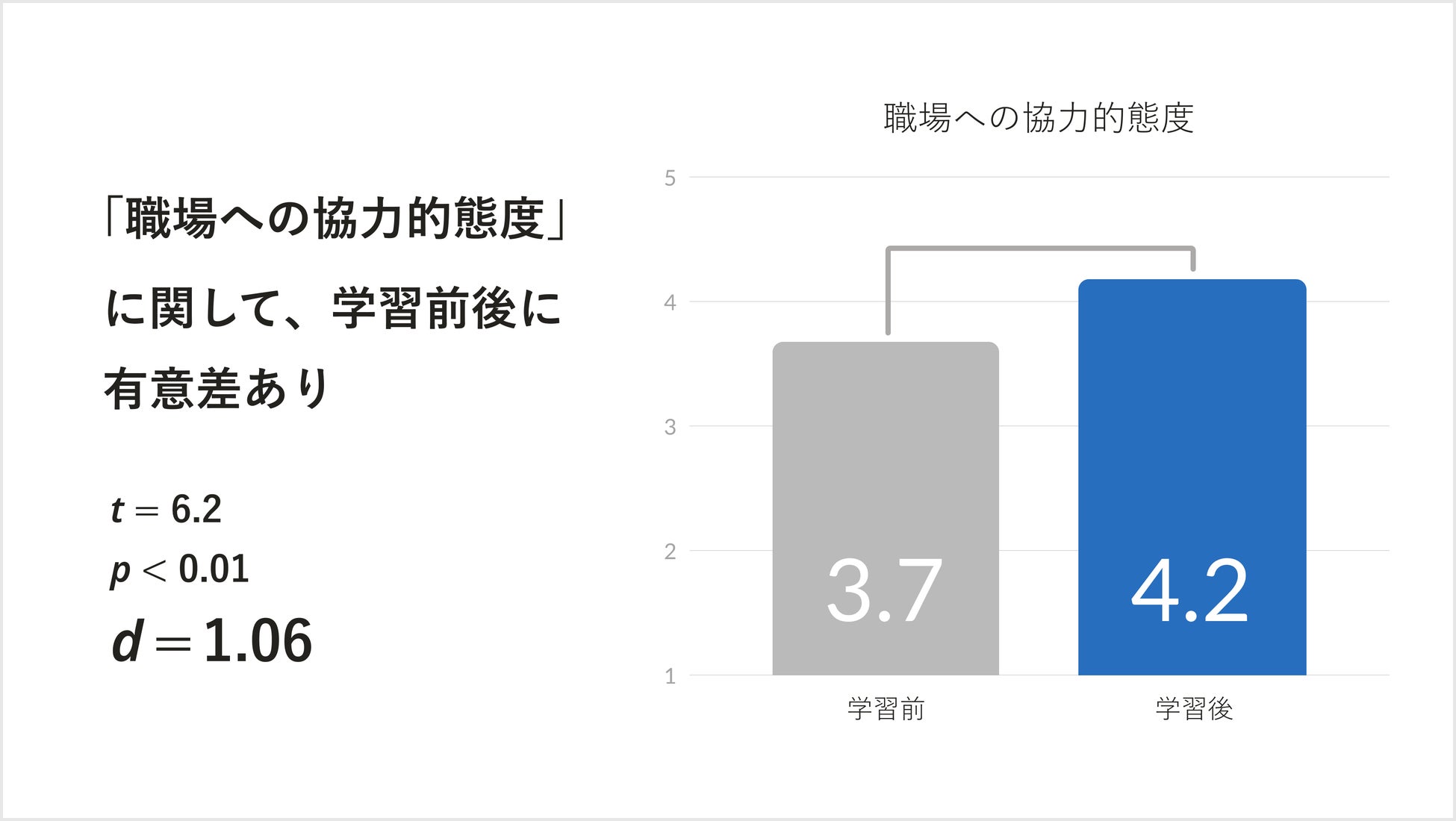 メッセージスコア以外にも自己回答式の質問票を用いて、マネージャー自身の社会性やマネジメントスタイルについて効果検証を実施した結果、「職場への協力的態度」という項目が改善したことを確認できました。メッセージの質を高めようとする動機付けによって、部下の日ごろの取組状況を意識的に観たり、それまで気付かなかった仕事の状況に目を向けたりするようになったことで、「部下の意欲を高めるための話をする」、「職場内の意見の相違や改善を励ます」、「問題やトラブルなどを率先して解決しようとする」等の行動変容につながったのではないかと考えています。こうしたマネージャーの変化については、一部の部下層からも認められており、今回の取組みはマネージャー育成策として非常に有効であると感じています。