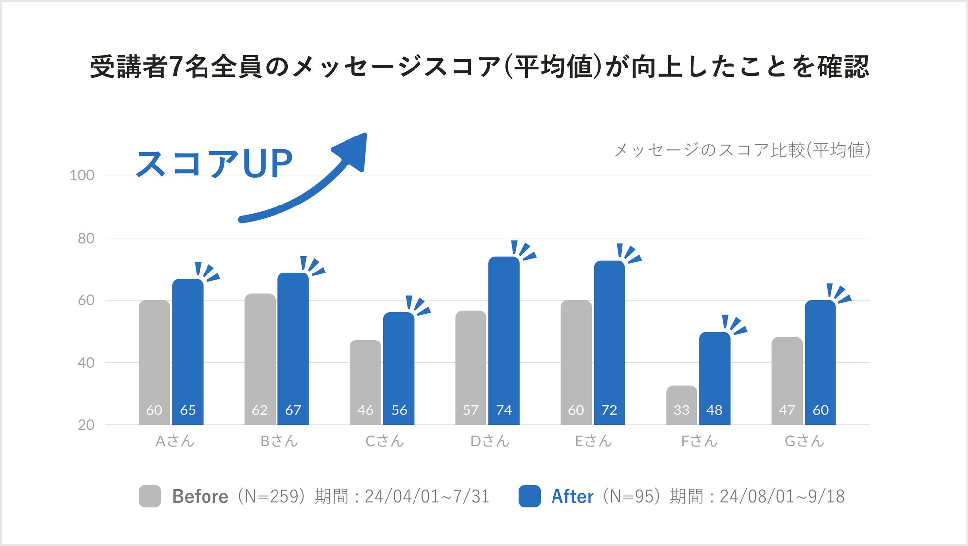 7月末から9月中旬の約1か月半で、7名のマネージャーを対象に学習させたところ、メッセージの質を評価するスコア(メッセージスコア)について受講者全員が向上し、10ポイント以上向上した人が多数という結果を得ました。相手との関係性や共有体験に言及し、具体的なエピソードも踏まえて書くように意識や行動が変わったことが、メッセージの質の明確な改善となって現れたと感じています。
