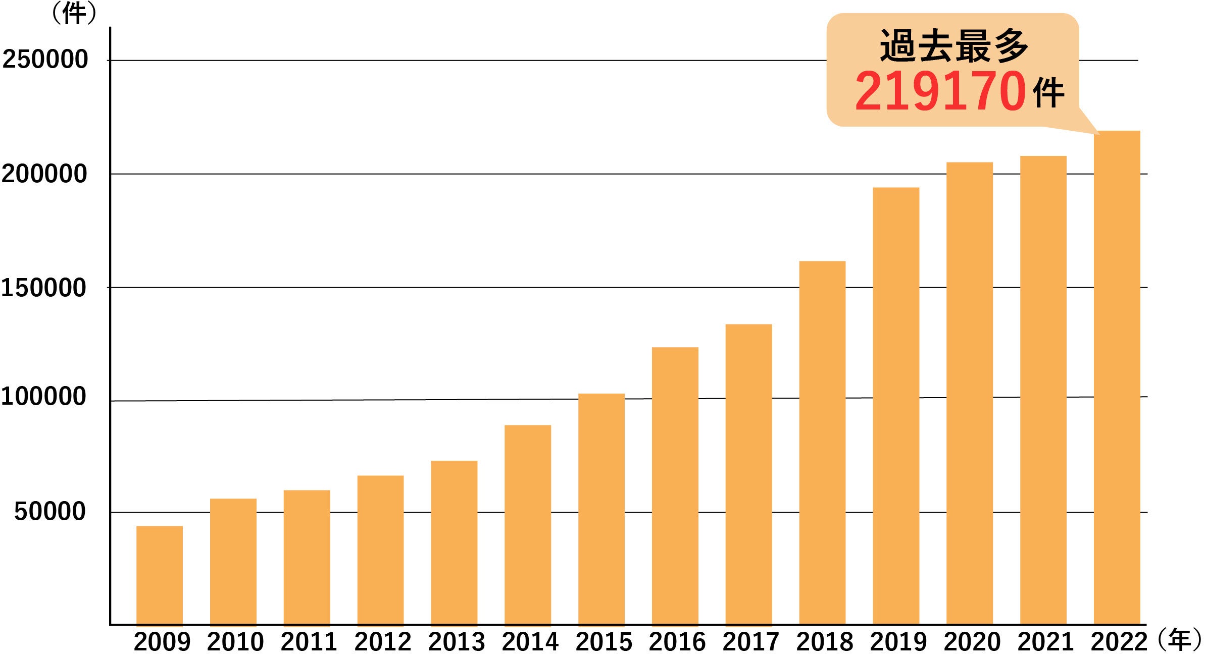この数値は前年度より5.5%(11,510件)増加 、統計のある1990年度以降で過去最多となっています。