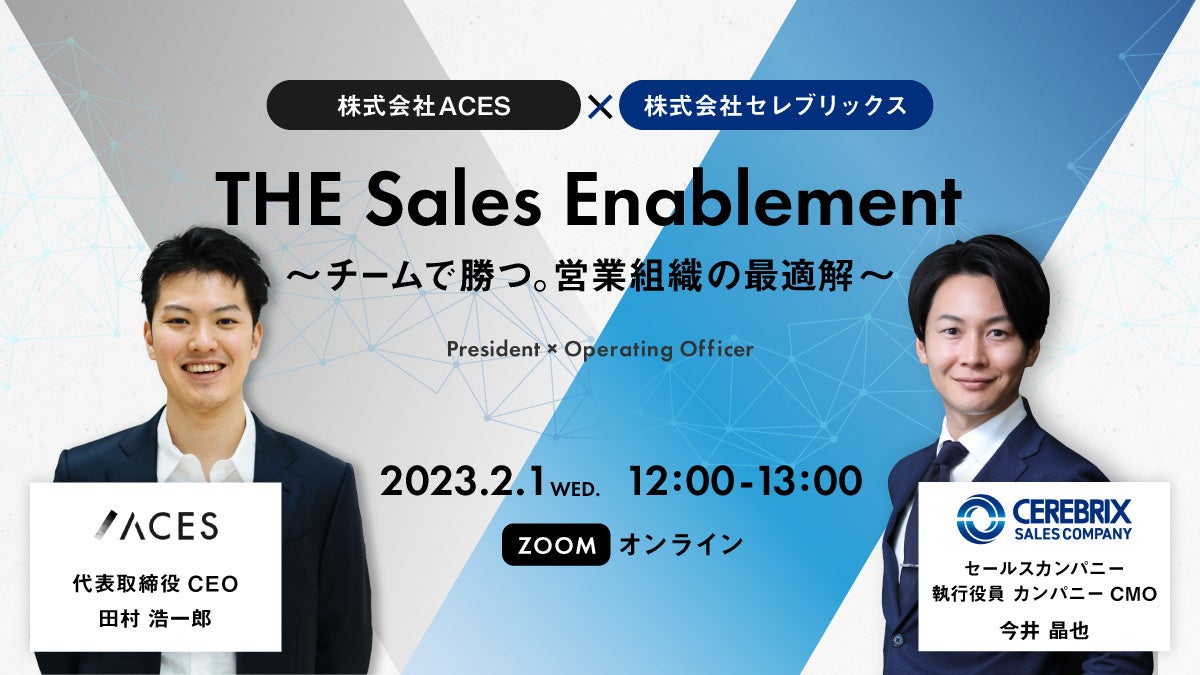 『THE Sales Enablement 〜チームで勝つ。営業組織の最適解〜 』は、ACESと株式会社セレブリックスが共催するオンラインセミナーです。昨今営業組織を強化・改善するための取り組みとしてセールスイネーブルメントに注目が集まっているものの、組織としての実践にまでは至ってない、具体的な取組方法がわからない、といった悩みを抱える方も多いのではないでしょうか。