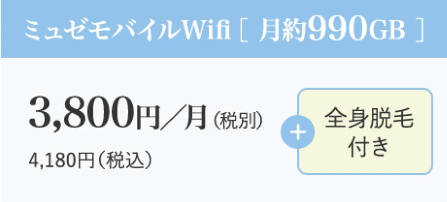 「ミュゼモバイル」は、「ミュゼモバイル SIM」と「ミュゼモバイル Wi-Fi」の2つのサービスプランから選択できます。ミュゼの全身脱毛1回がセット※になった契約プランを100円(税込110円)からご用意しました。全国の「どこでもミュゼ」登録店舗(2025年8月現在、加盟店登録285店舗)にて全身脱毛1回をご利用いただけます。