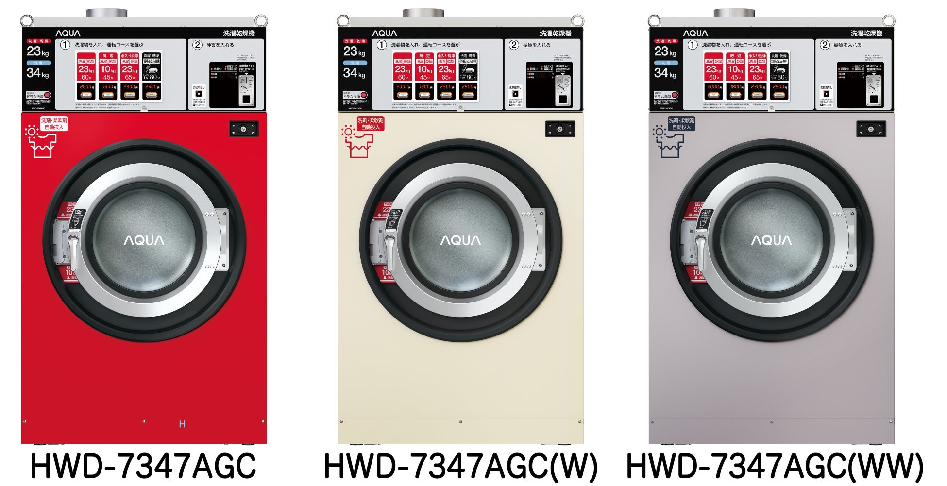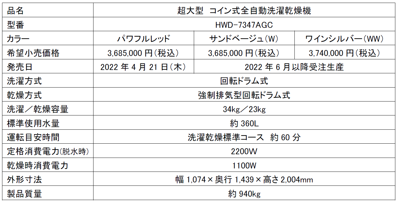 当社はこれまでコインランドリー向け機器として、洗濯乾燥容量が10kgと16kgの大型洗濯乾燥機を展開してまいりましたが、増加する洗濯物量や大物洗いのニーズに対応するべく、洗濯容量34kg/洗濯乾燥容量23kgの超大型コイン式全自動洗濯乾燥機(HWD-7347AGC:以下、本商品)を発売いたします。