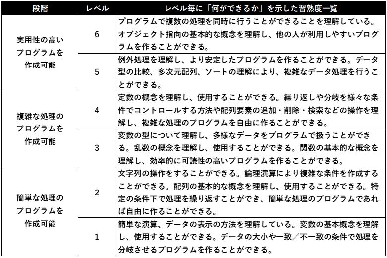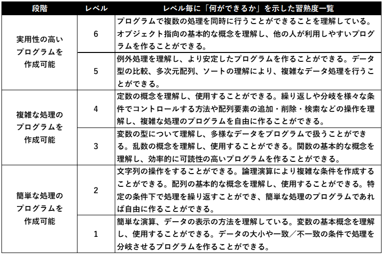 この度公開したCFRPは実際の教育現場での学習者の状況や、検定実施によって培った作問・評価のノウハウから、汎用的かつ詳細な形でプログラミングの基礎知識を概念としてまとめ、その習得度を3つの段階(簡単な処理のプログラムを作成可能、複雑な処理のプログラムを作成可能、実用性の高いプログラムを作成可能)及び6つのレベルとして定義しています。また6つのレベルはさらに詳細な60以上のプログラミング概念※に分解することができ、具体的にどのような知識が必要であるかを詳細に定義しています。これにより、教育者あるいは教材の作成者は学習者の個々の習熟度に合わせた効果的な指導や評価が可能となり、限られた時間の中で最大限の教育効果を実現することができます。
