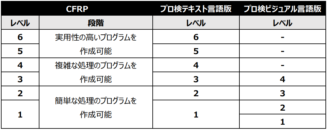 プログラミング能力検定協会が提供するプロ検はCFRPに準拠しております。プロ検を受検いただくことで、CFRPに沿い現状のプログラミング能力値を測定・把握することが可能です。