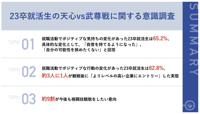 天心vs武尊戦を観戦した23卒就活生、65.2%が就活にポジティブな気持ちの変化。うち行動の変化は8割以上。3人に1人が「よりレベルの高い企業にエントリー」と激闘の様子が見える結果に。