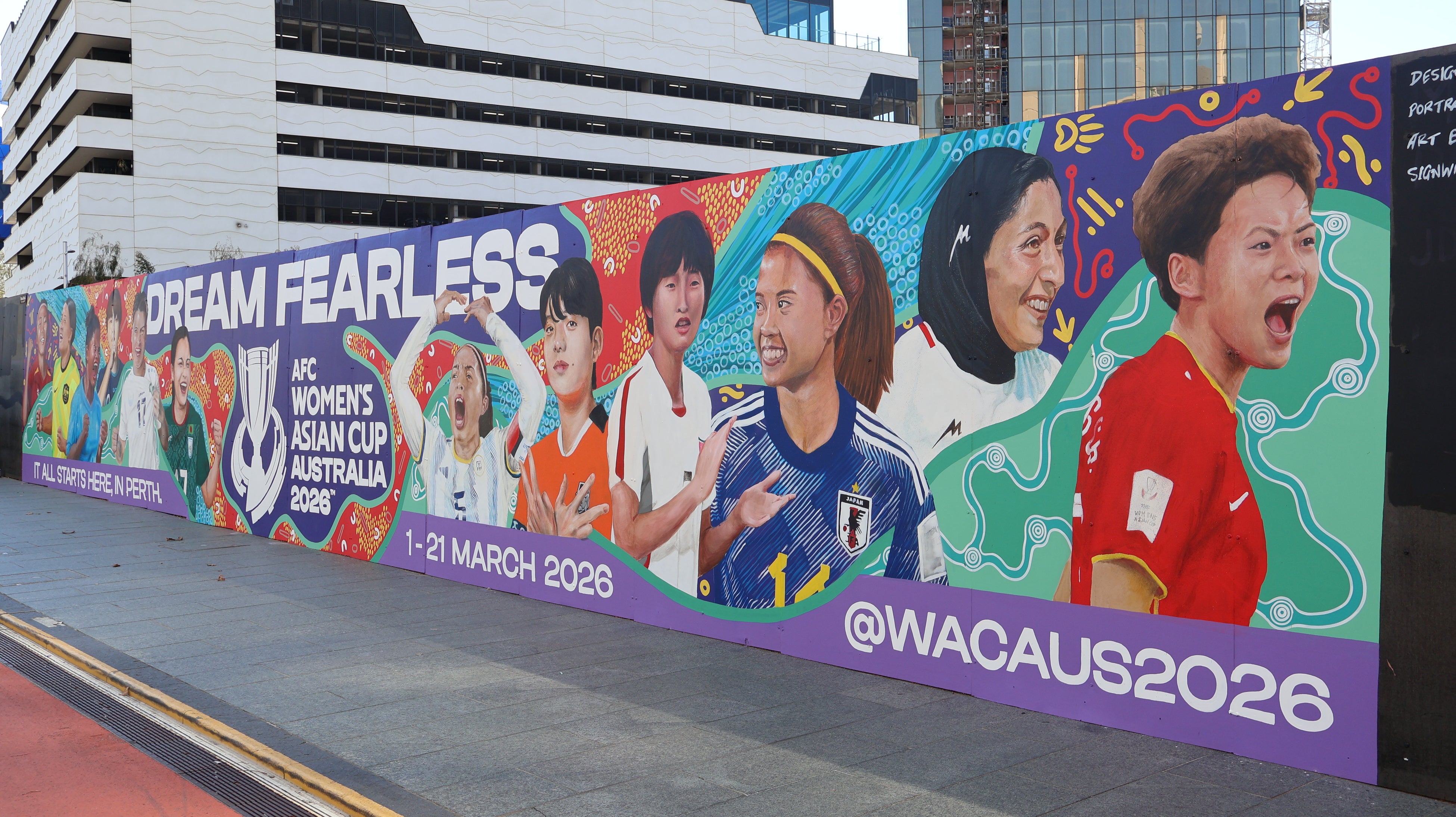 「パース」の街の中心部には、この大会を記念し、先住民アボリジナルのアーティストであるジェイド・ドールマン氏と、「パース」の壁画アーティストのマイケル・ベッツ氏のコラボレーションによって描かれた17メートルの壁画が登場。“なでしこジャパン”主将の長谷川唯選手をはじめ、出場12カ国のスター選手たちが描かれたこの壁画は、大会の力強さとグローバルな精神を象徴し、2026年3月末まで掲示されます。