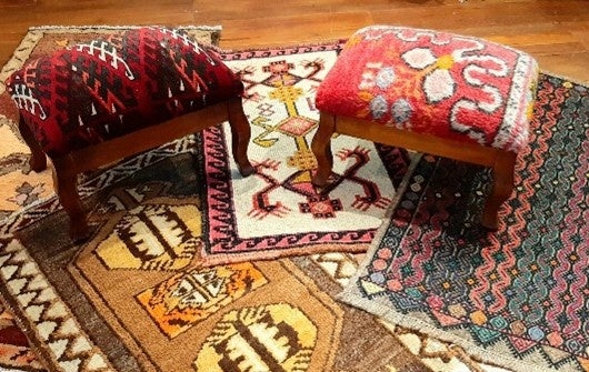 スペインやインドのものをはじめ、中近東のキリムや民具、東南アジアや中南米、アフリカのものなどまさに”世界民芸”を多く取り揃える、1971年から続く京都の西洋民芸店「グランピエ」のスツールとラグ。スツールは古い椅子の座面を古いキリムで張替えたもの。玄関やコーナー用の小さいキリムはぜひ入門編としてチャレンジしてみてください。