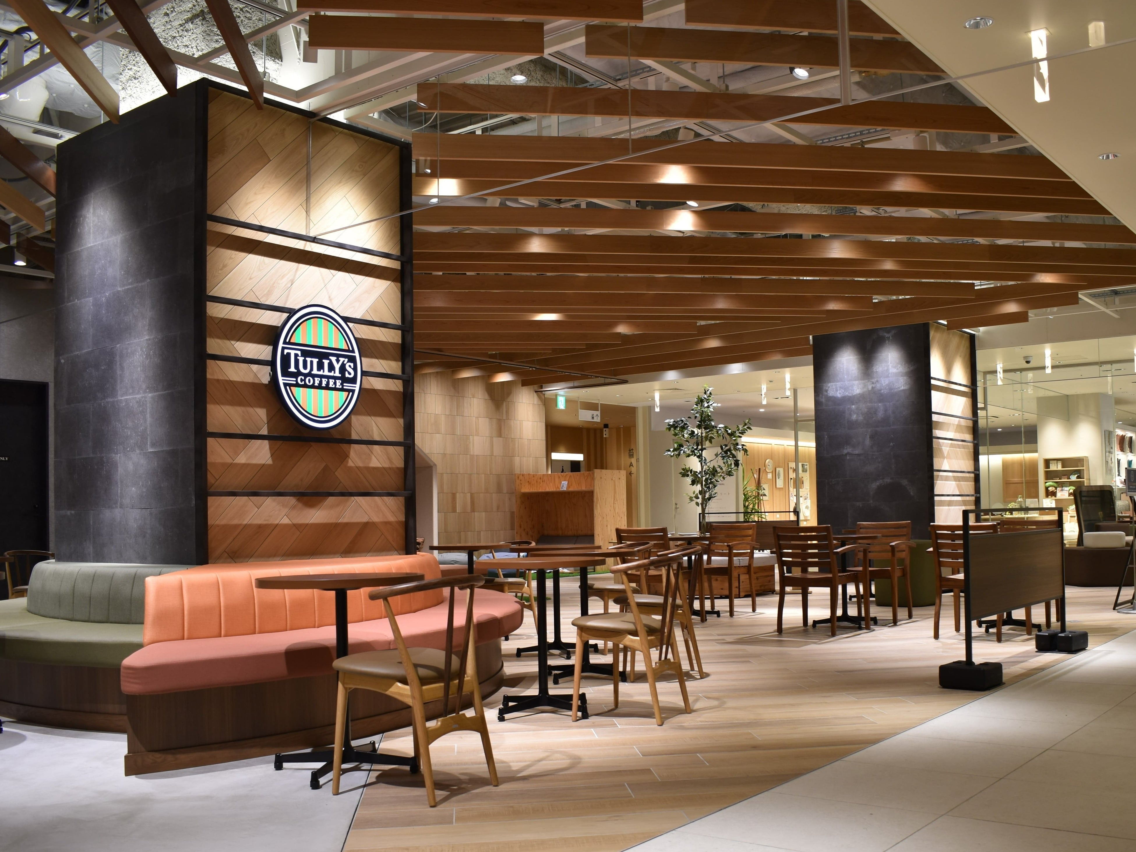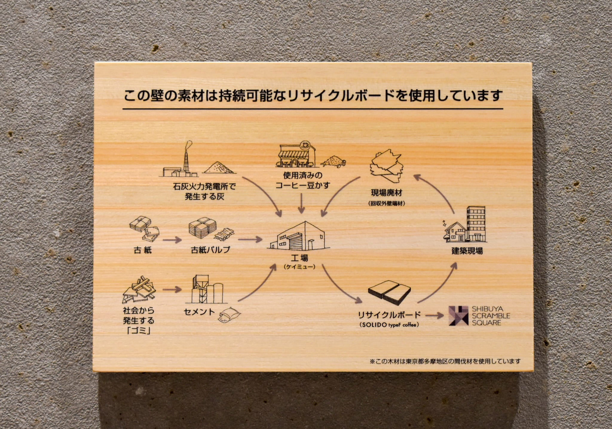 本イベントの開催場所となる「TULLY’S COFFEE commu square」の店内は、スケルトン天井にすることで天井高が上がり、開放感のある空間です。客席什器にはゆったりとリラックスできる椅子やソファを採用しました。壁材や柱回りの素材には、コーヒー豆ガラを混合させた素材や原材料の一部にリサイクル材を混合させたセメントなど、お店づくりに持続可能なリサイクルボード(SOLIDO typeF coffee/typeM FLAT)を利用しています。