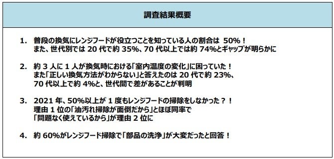 普段の換気にもレンジフードが役立つことを知っている人の割合が20代は70代の半分以下と、世代間でギャップが明らかに