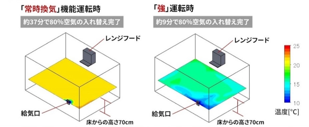 FUJIOHで換気による空気の流れの速さと、空間、床面、壁面の温度変化をシミュレーションしました。その結果、室内の空気が80%入れ替わった際、レンジフードは「強」運転よりも、「常時換気」機能運転に設定し室内換気を行った方が、平均室温は約3℃、床面・壁面の平均温度は約2℃高いことがわかりました。