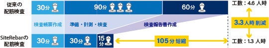 検査帳票作成から報告書作成までの手作業による転記作業を省略。従来の配筋検査と比較して、検査時間を約60%短縮し ※3、作業を効率化。