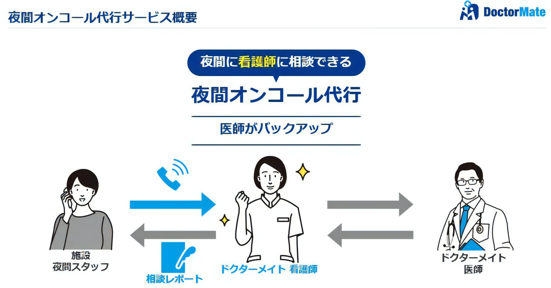 全国の入居型介護施設で業務として実施されている夜間オンコールの対応を、施設看護師に代わって、全国のドクターメイト看護師(夜間オンコールナース)が代行します。
