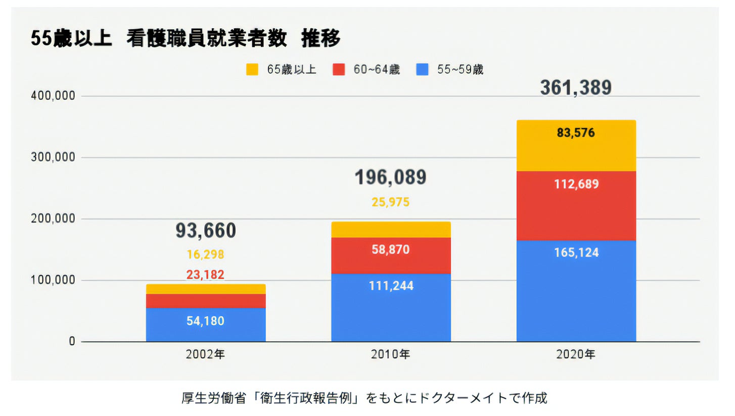 厚生労働省の調査によると、2020年末での看護職員数は約166万人にのぼり、増加傾向にあります。そのうち55歳以上の看護職員就業者数も増え、2022年では約36万人と2002年の約9万人から4倍近い数字になります。現在では、看護職員の9人に1人が60歳以上を占めるほど、高齢化問題は看護業界においても非常に深刻なものとなっています。