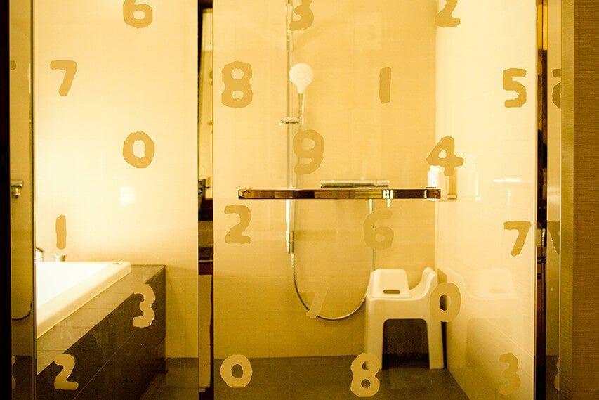 全面ガラスのバスルーム扉にも SO-SU-U(十数)柄